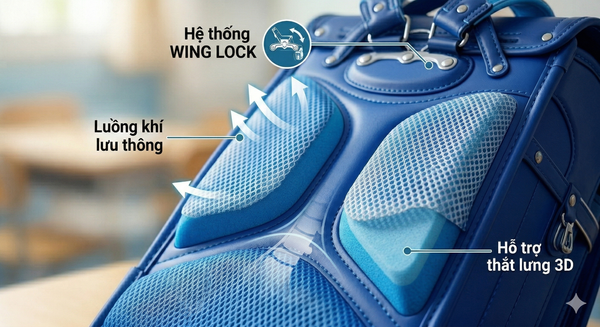 - Thiết kế 3D ôm sát: Phần lưng cặp có các múi đệm mềm mại, giúp không khí lưu thông và ôm khít đường cong sinh lý của trẻ.