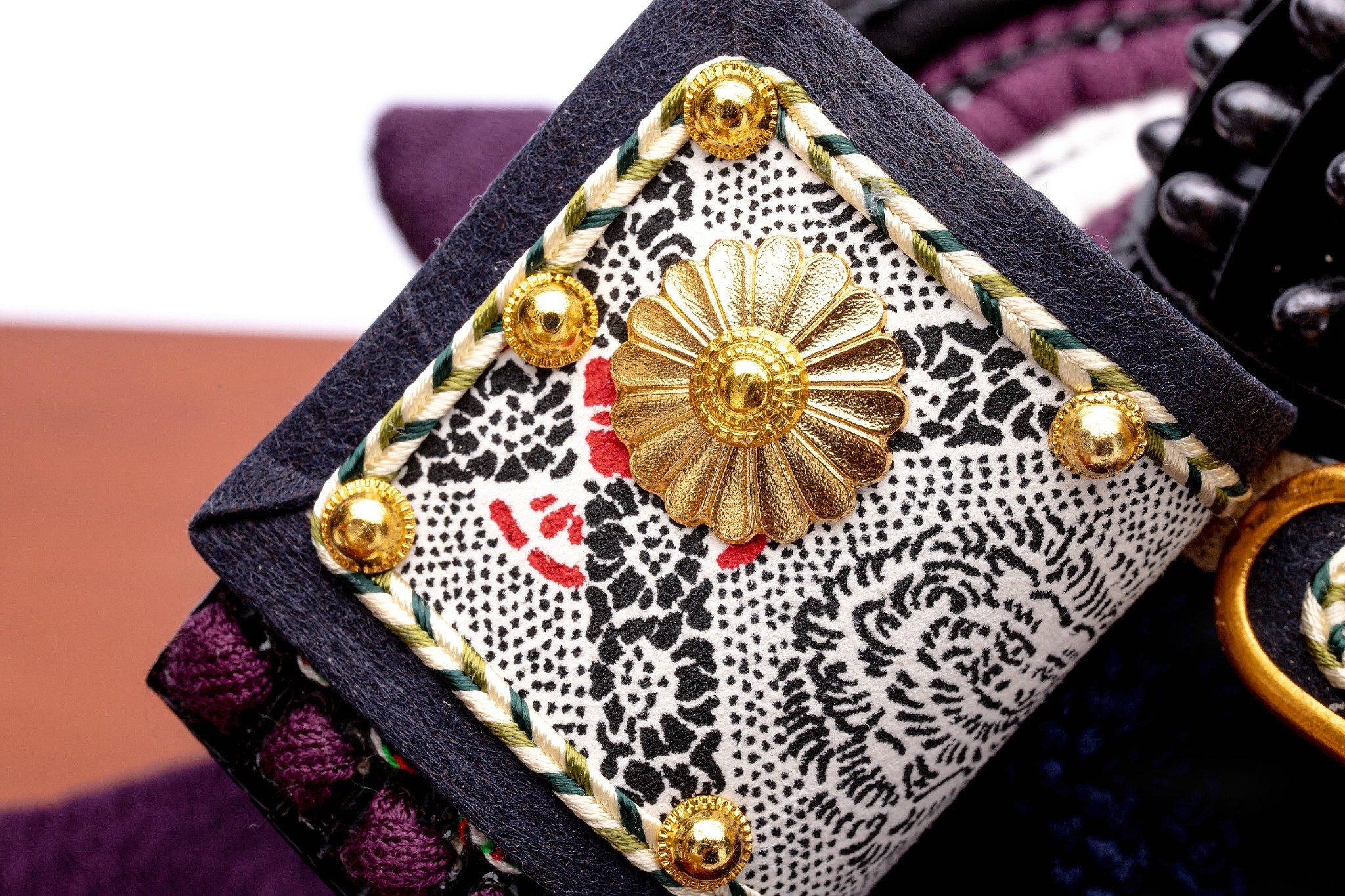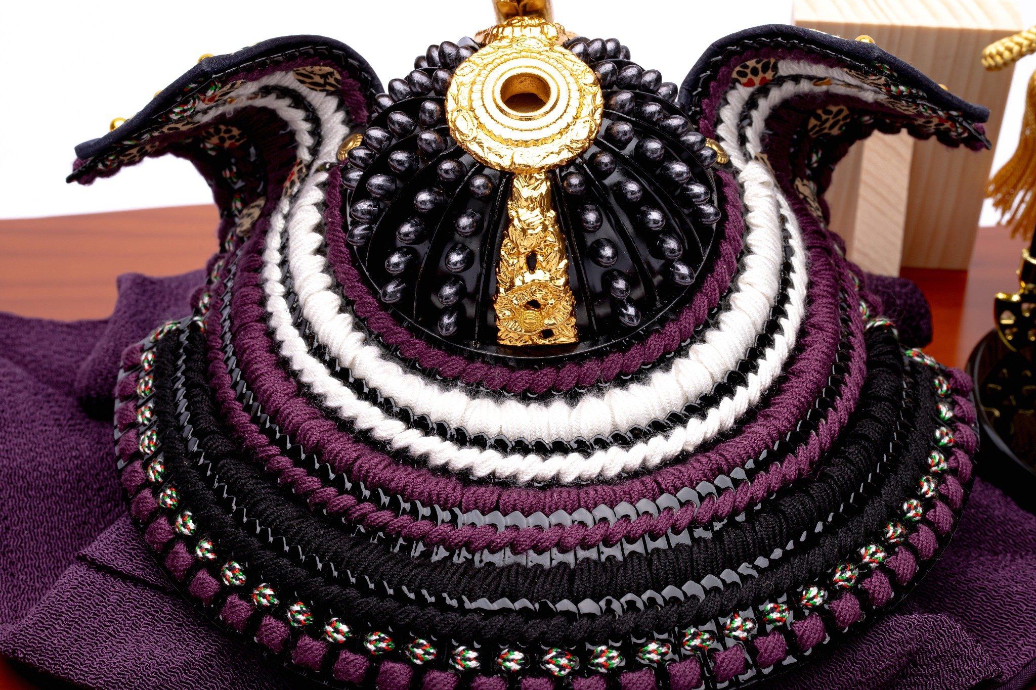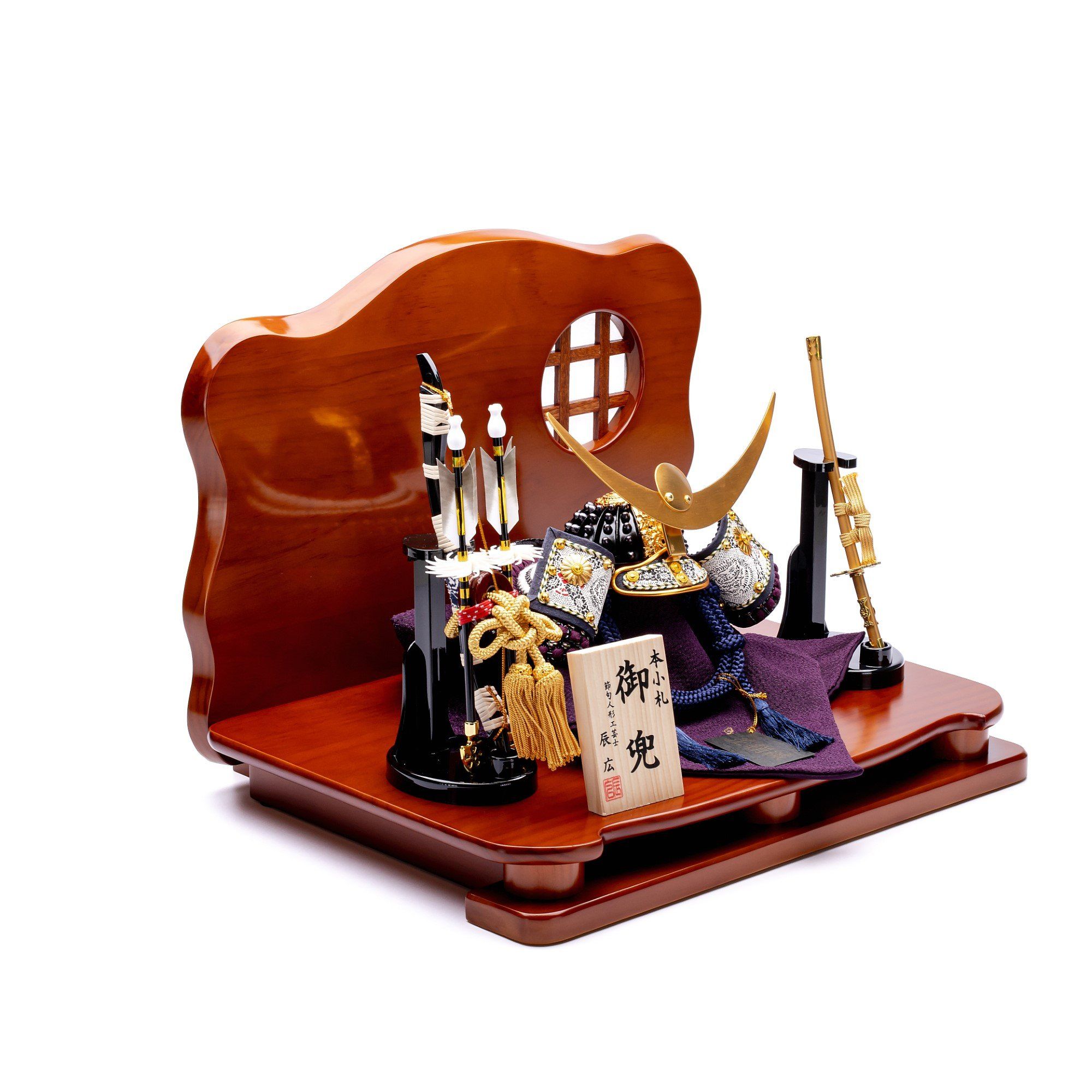 Bộ mũ Samurai màu đen. Bức bình phong bằng gỗ sơn mài nền trơn. Sản phẩm được đặt trên đế gỗ kèm theo khăn lót và bảng ghi tên tác giả. Phụ kiện đi kèm gồm bộ cung tên và kiếm Katana.