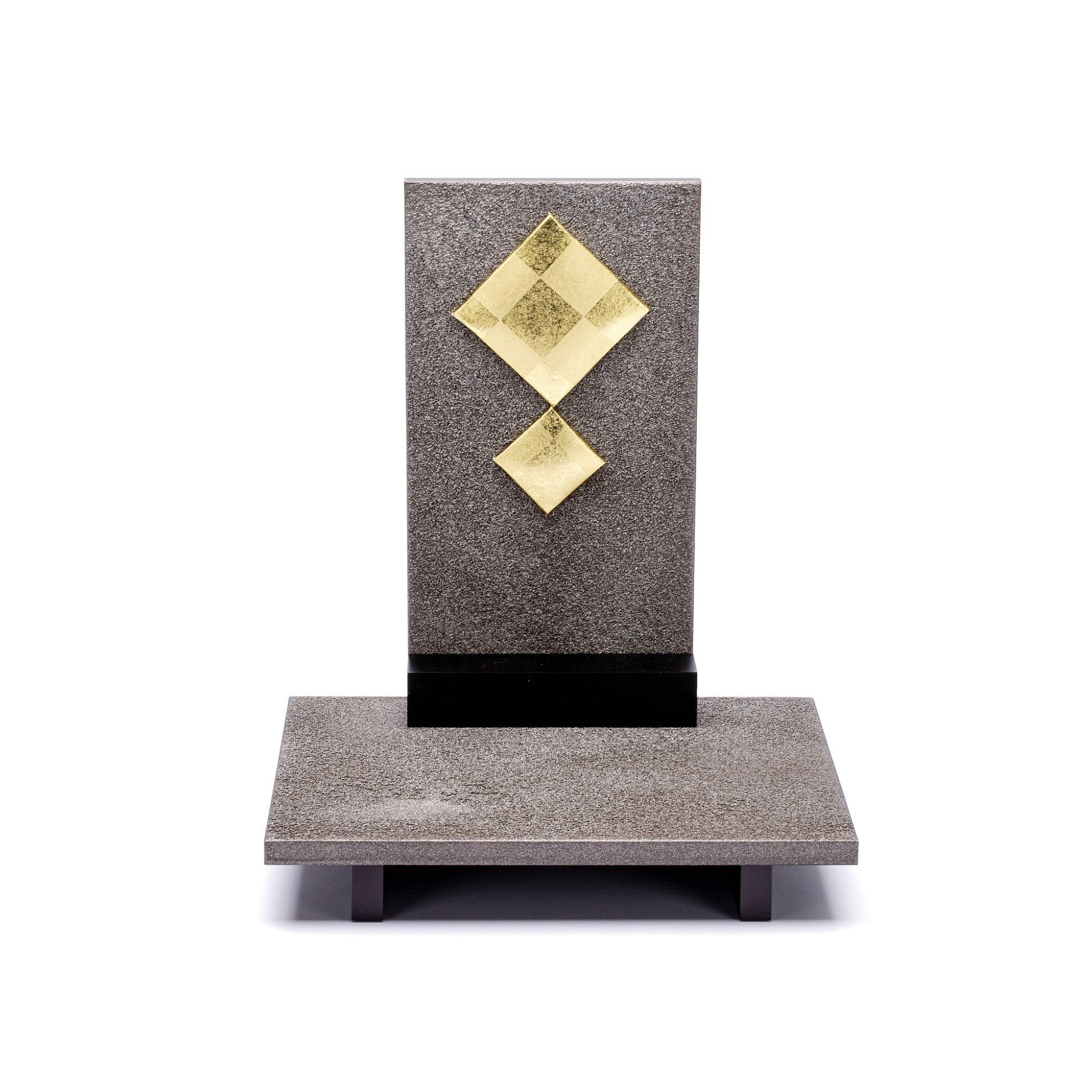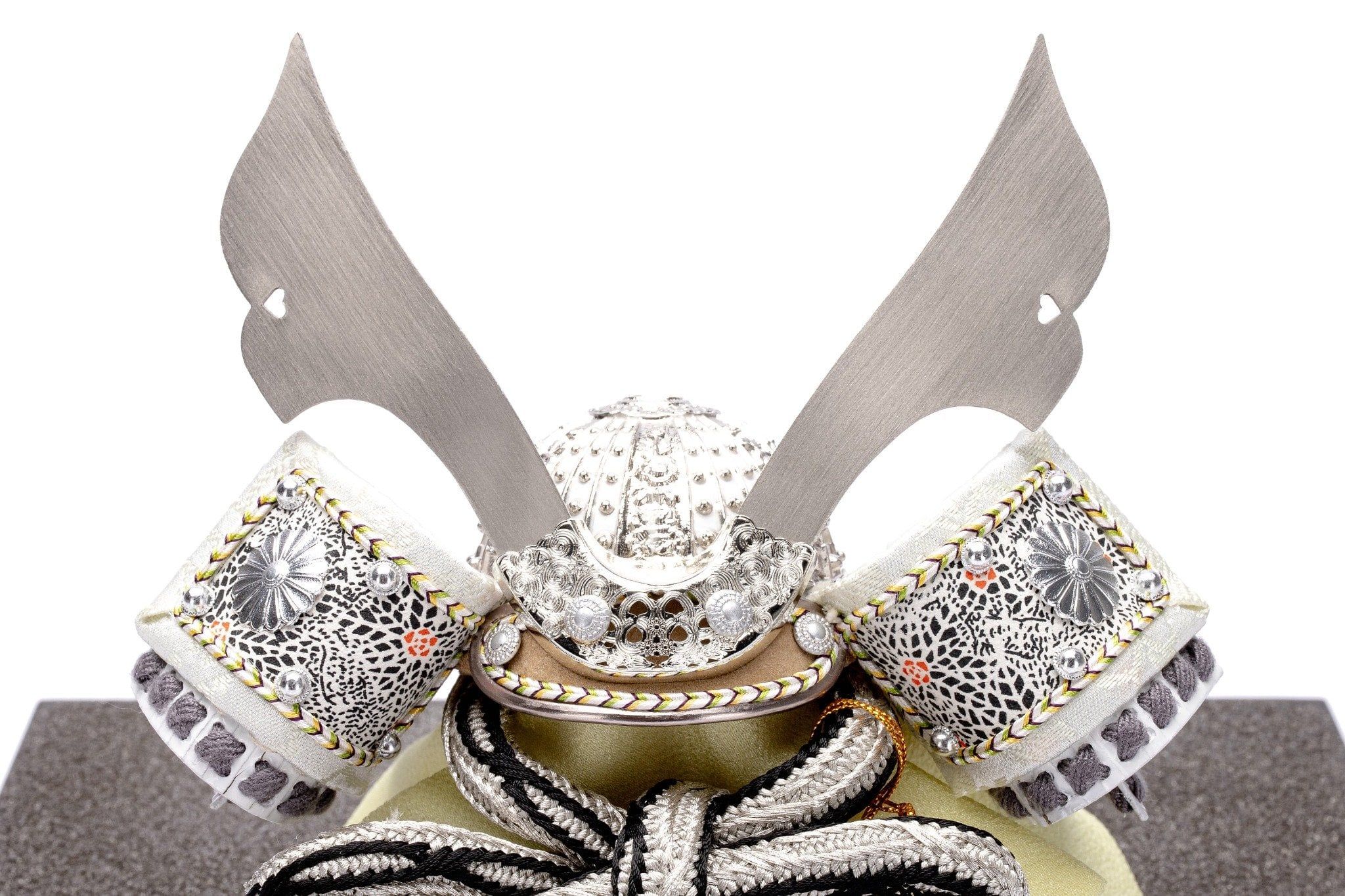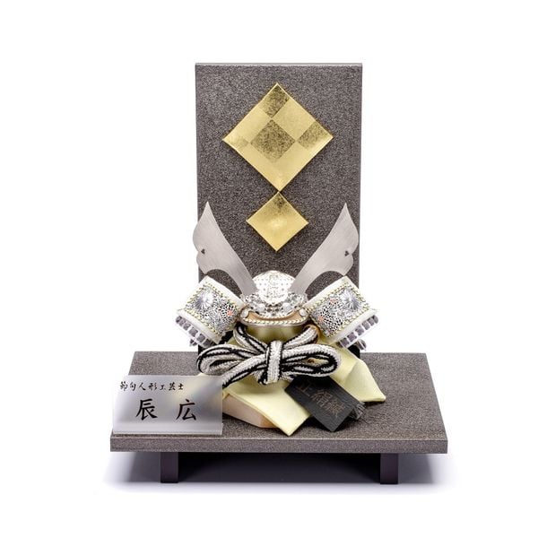 Bộ mũ Samurai màu xám bạc. Bức bình phong nền hình vuông màu vàng và đế gỗ sơn mài màu xám trơn. Sản phẩm được đặt trên đế gỗ kèm theo khăn lót và bảng ghi tên tác giả.