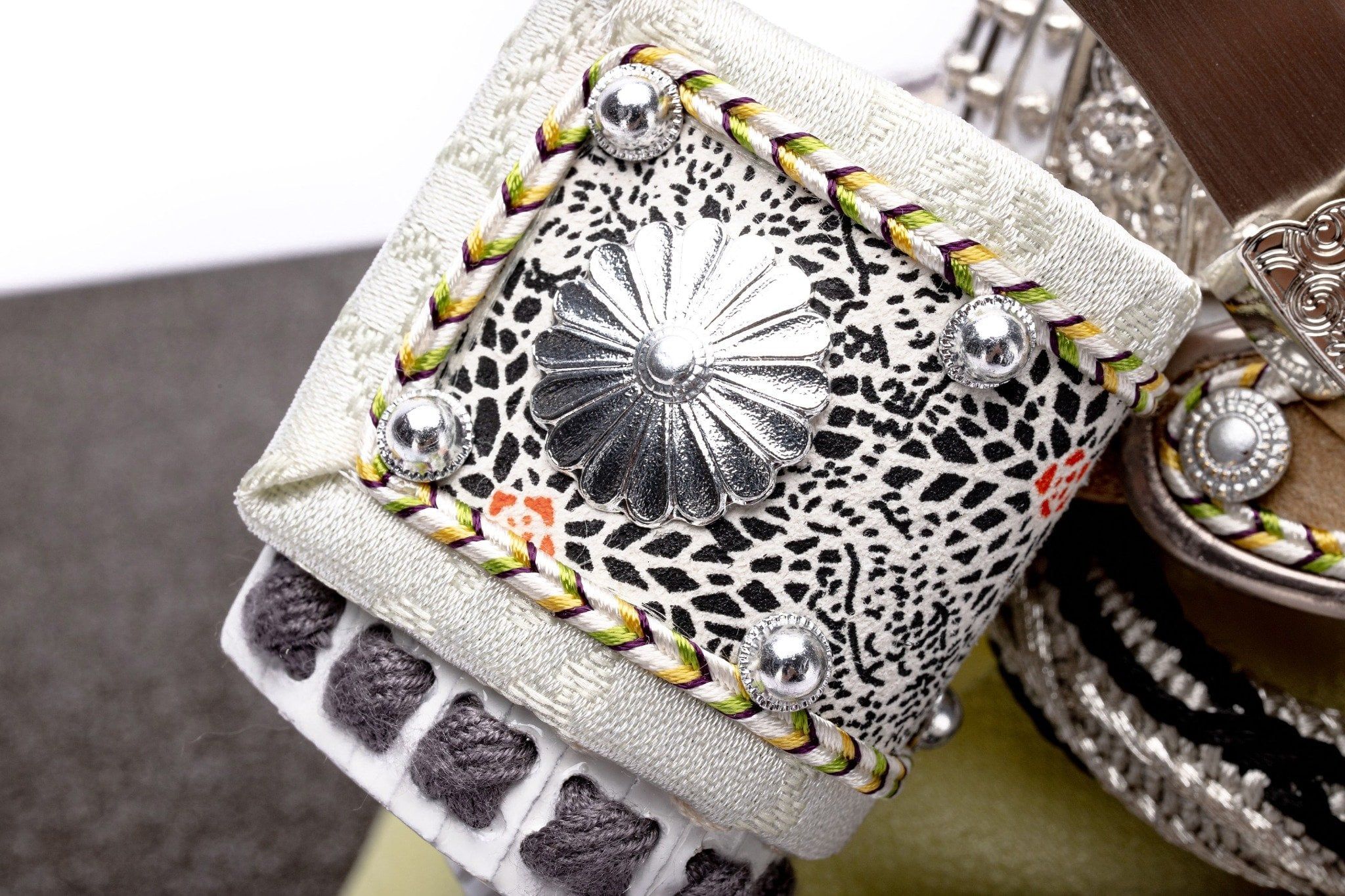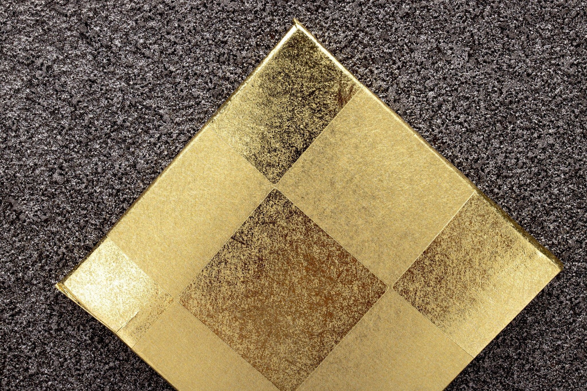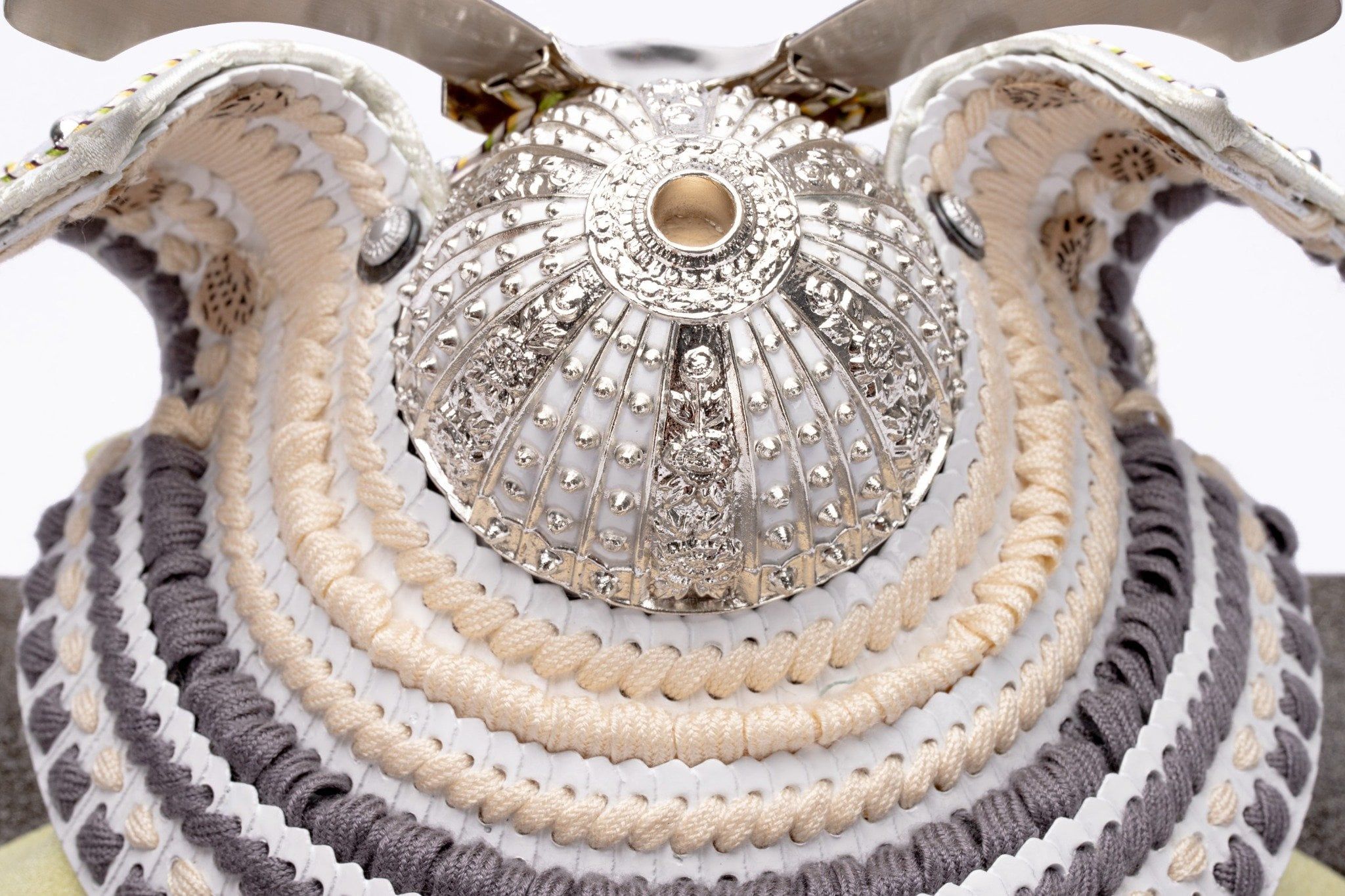 Bộ mũ Samurai màu xám bạc. Bức bình phong nền hình vuông màu vàng và đế gỗ sơn mài màu xám trơn. Sản phẩm được đặt trên đế gỗ kèm theo khăn lót và bảng ghi tên tác giả.