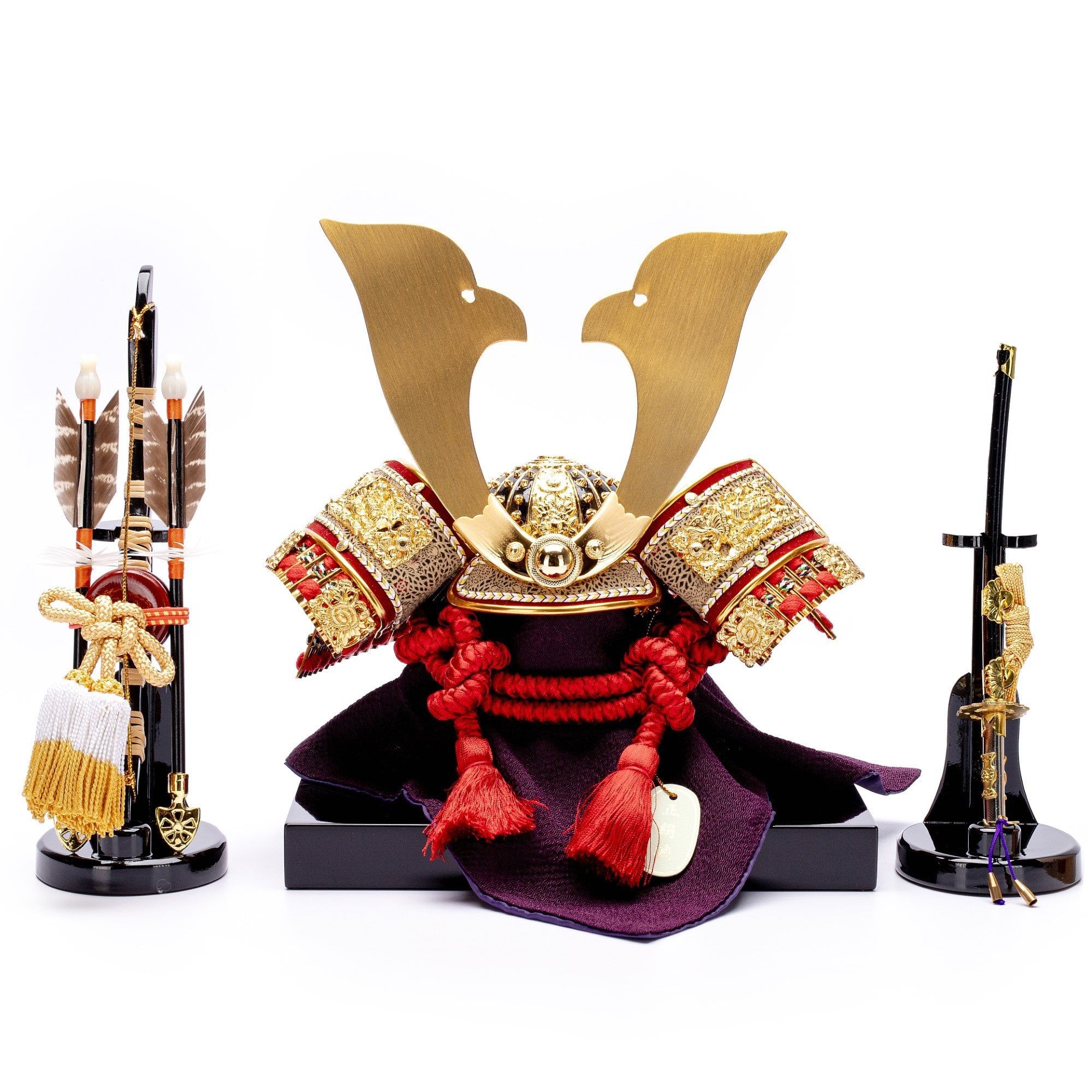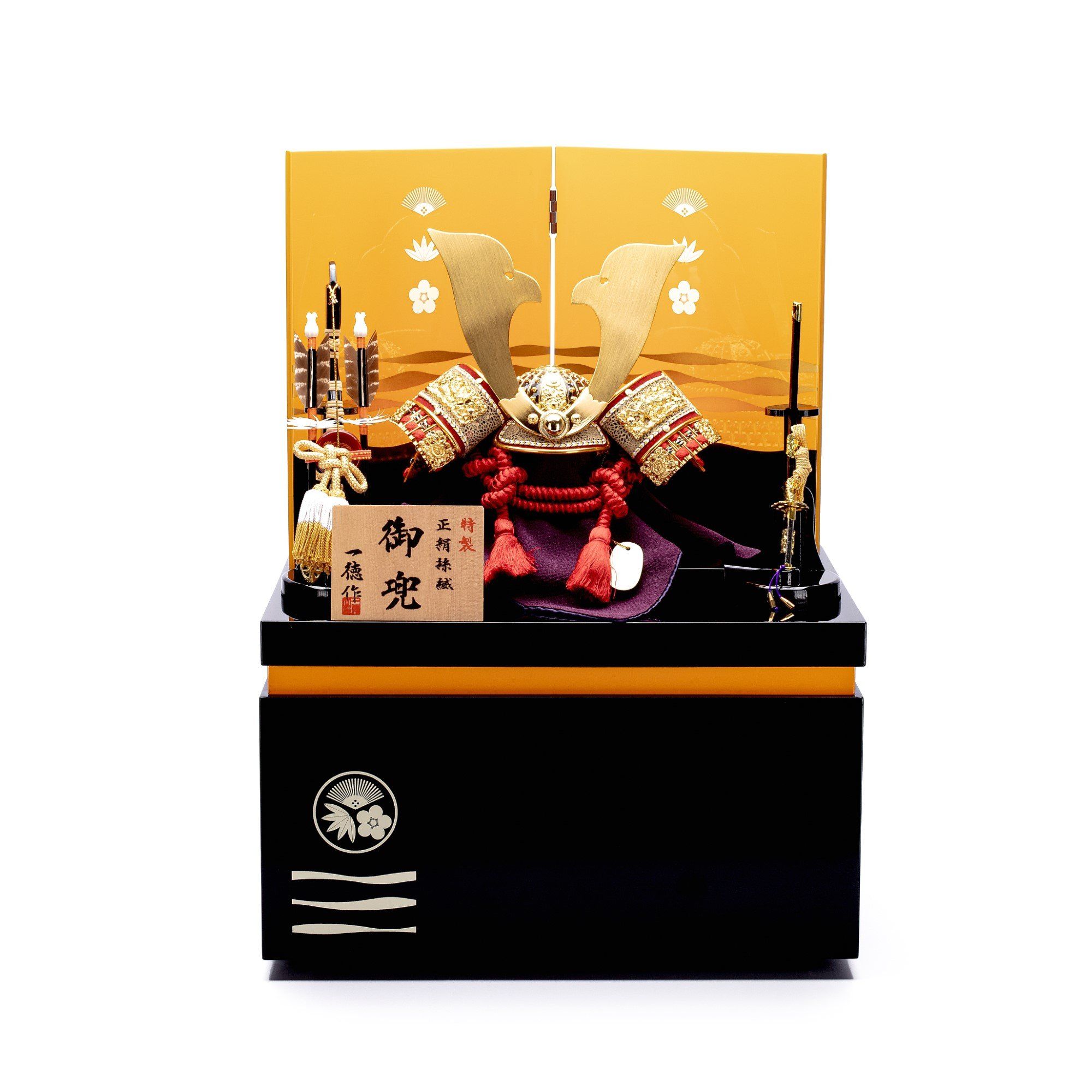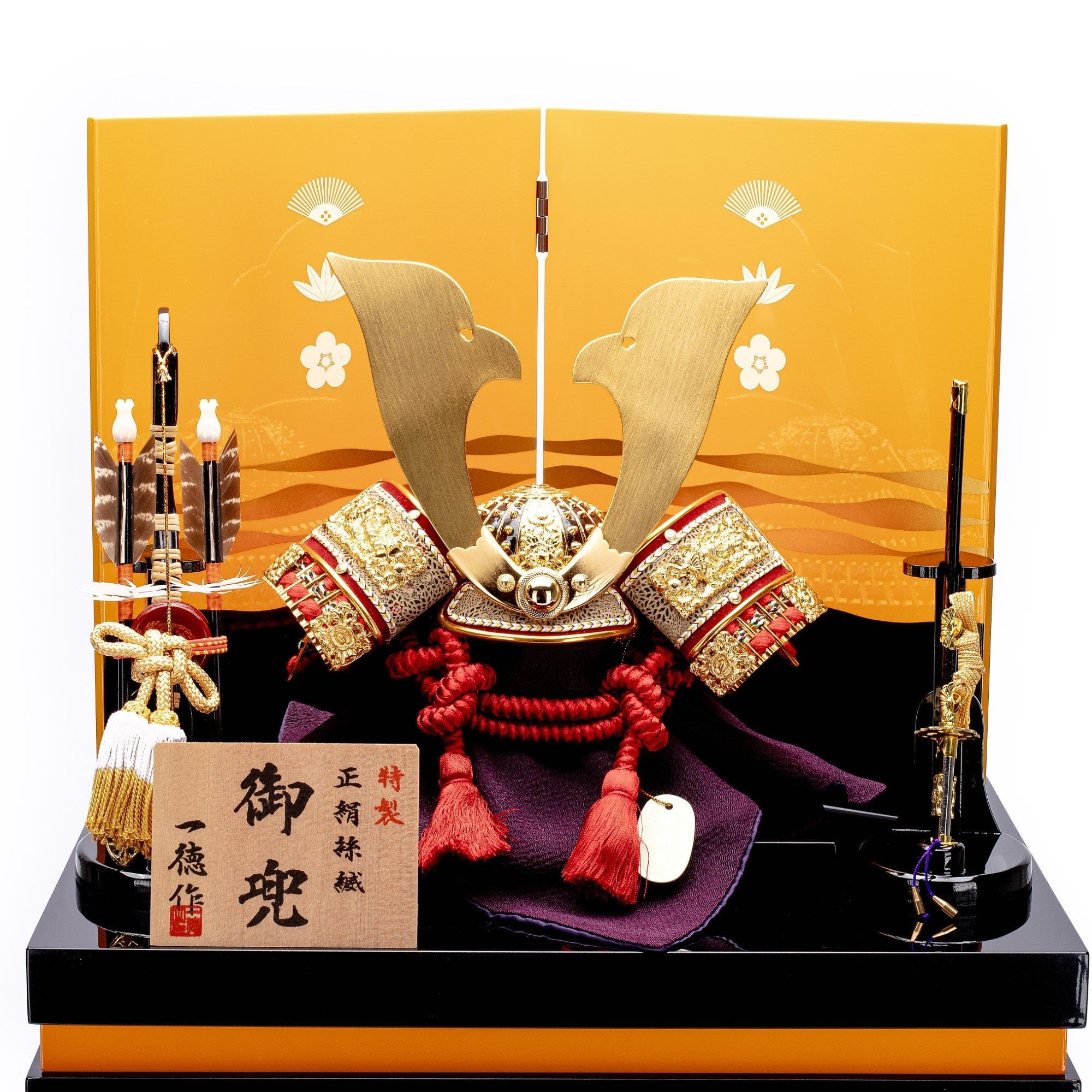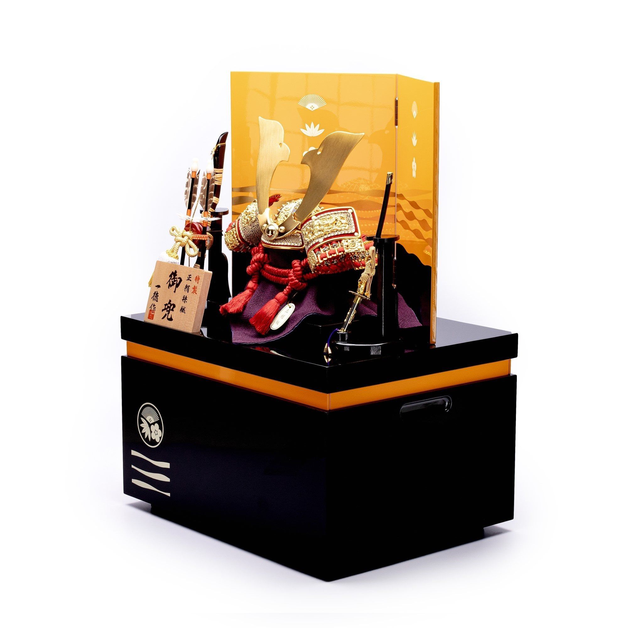 Bộ mũ Samurai màu đỏ mạ vàng, Bộ bình phong 2 tấm vẽ họa tiết quạt, lá trúc và hoa anh đào, bằng gỗ sơn mài thếp vàng. Sản phẩm được đặt trên thùng gỗ và đế gỗ cũng được làm từ sơn mài bên cạnh có bảng ghi tên tác giả. Phụ kiện trang trí đi kèm bao gồm bộ cung tên và kiếm Katana.