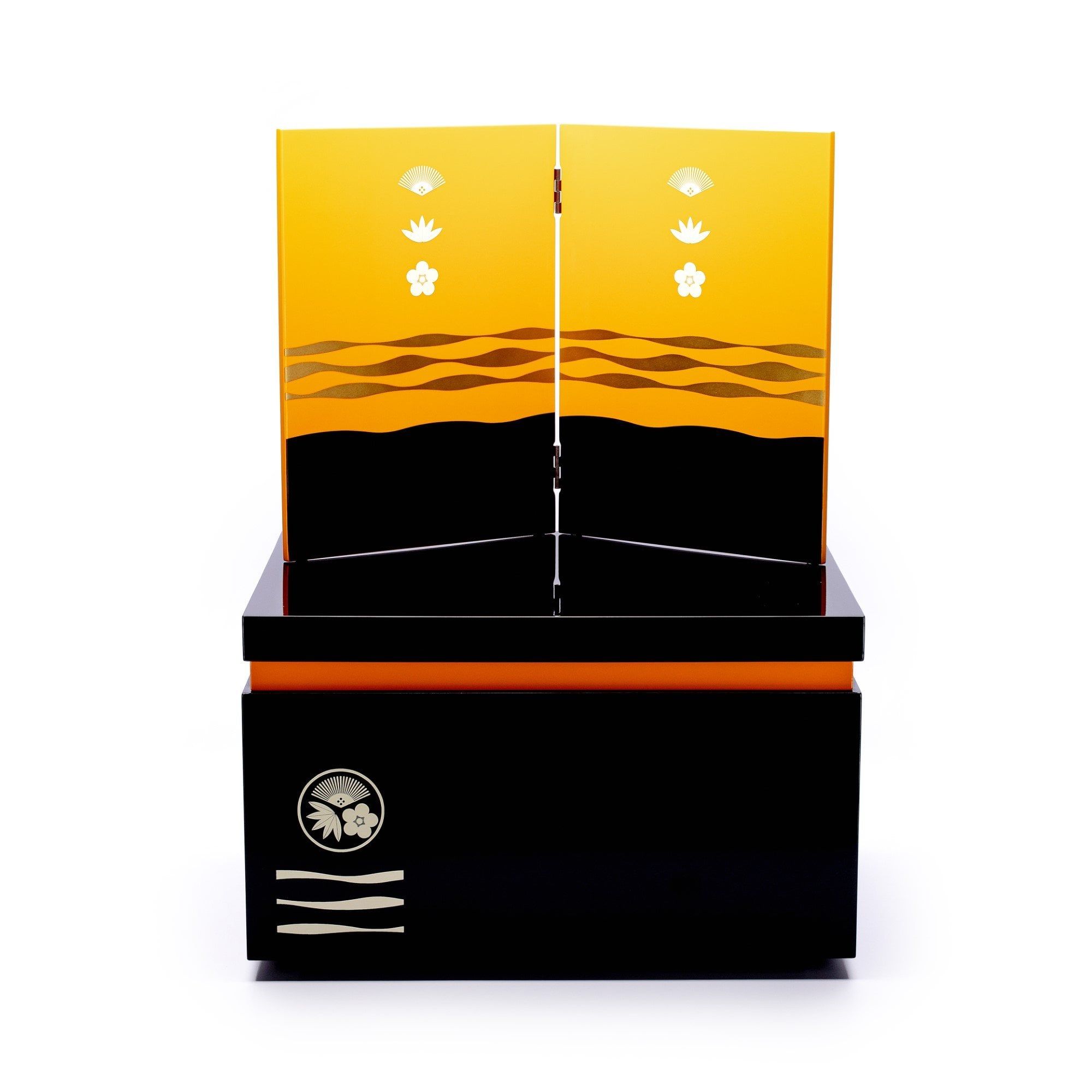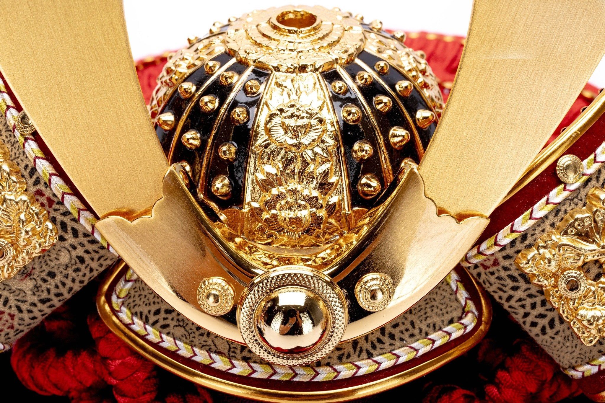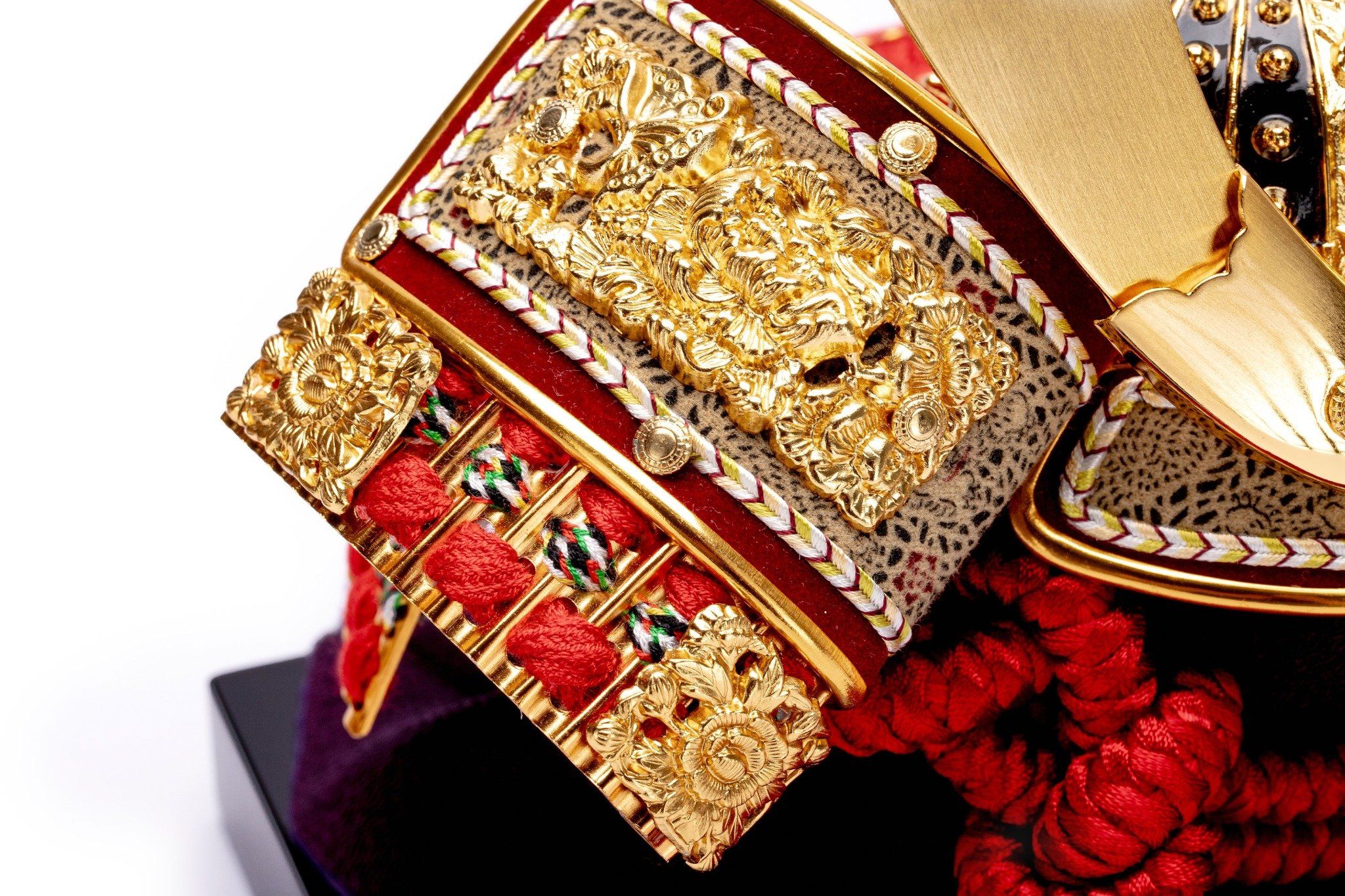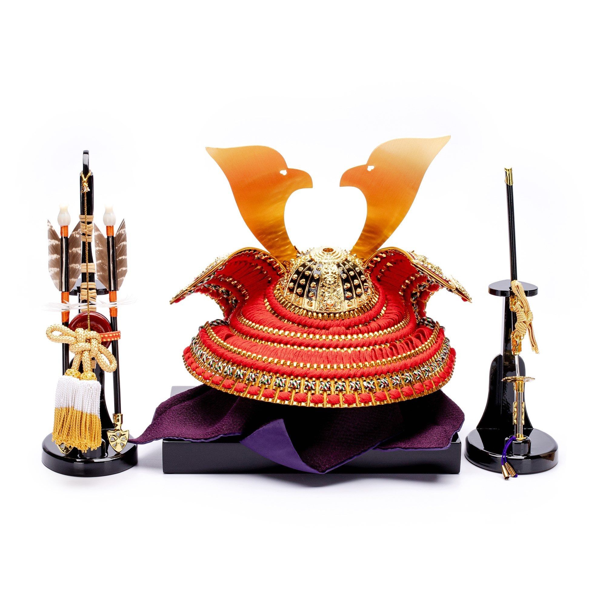 Bộ mũ Samurai màu đỏ mạ vàng, Bộ bình phong 2 tấm vẽ họa tiết quạt, lá trúc và hoa anh đào, bằng gỗ sơn mài thếp vàng. Sản phẩm được đặt trên thùng gỗ và đế gỗ cũng được làm từ sơn mài bên cạnh có bảng ghi tên tác giả. Phụ kiện trang trí đi kèm bao gồm bộ cung tên và kiếm Katana.