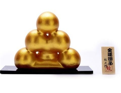 Tượng được tạo hình từ 6 Daruma màu vàng óng ánh, xếp chồng lên nhau theo hình kim tự tháp.