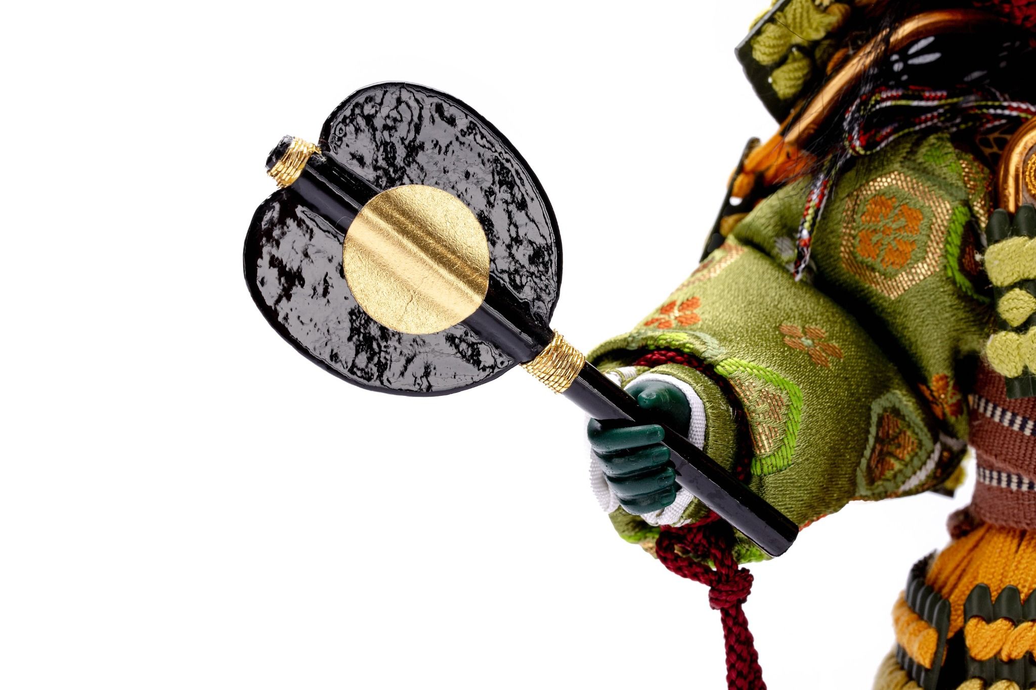 Búp bê có bộ giáp màu xanh lá đứng trên phong nền trắng và tay cầm quạt.