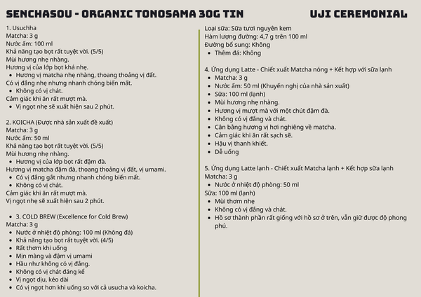Dù bạn đang tìm kiếm sự an nhiên trong trà đạo, năng lượng cho ngày mới, hay nguồn cảm hứng trong ẩm thực, Matcha Uji Organic Tonosama luôn là người bạn đồng hành tuyệt vời. Một chén Tonosama mỗi ngày – để cảm nhận sự cân bằng, thư thái và tinh hoa đích thực của văn hóa Nhật Bản.