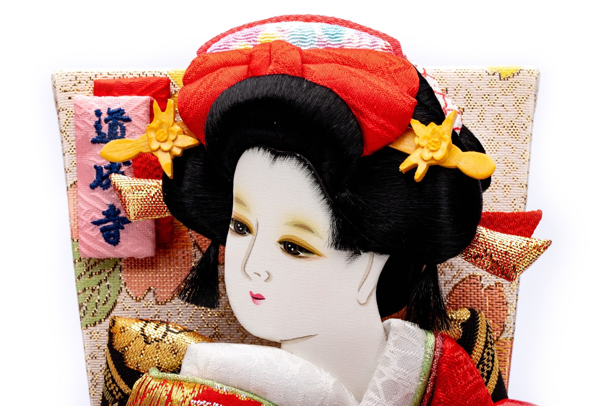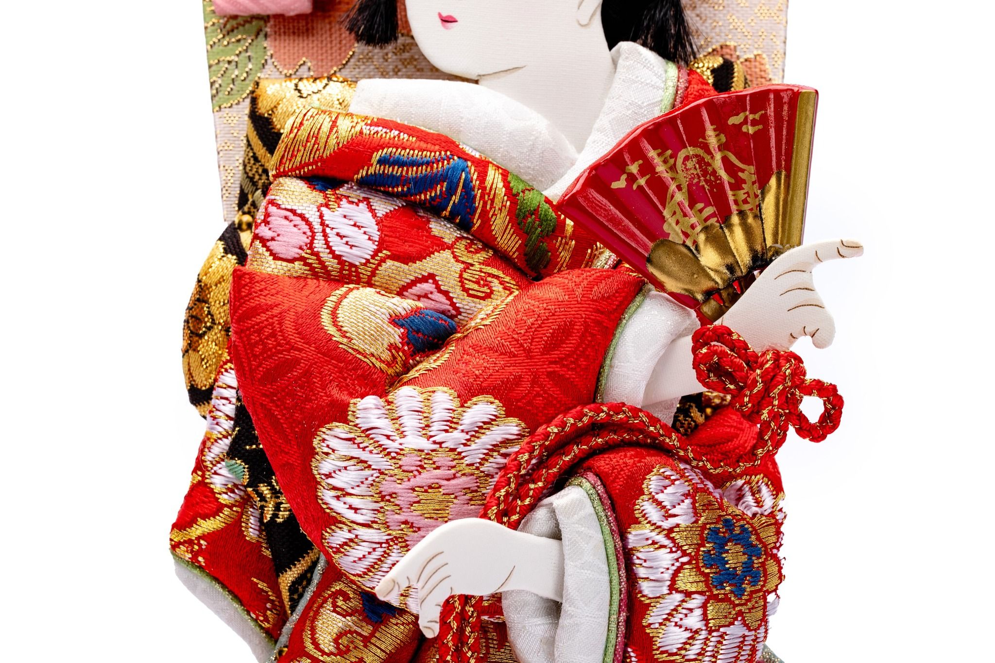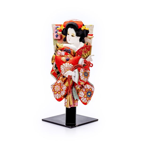 Đây là một tấm bảng lông mềm tuyệt đẹp và dễ thương với trang phục xoắn. "Dojoji" là một vở kịch nổi tiếng trong kabuki và múa Nhật Bản. Dưới bóng hoa anh đào nở rộ, cảnh Hanako nhảy múa với quạt rất tuyệt vời và tràn đầy nét duyên dáng. Quạt này được ưa chuộng như một vật may mắn cho các bé gái vào dịp Tết. Kinran được sử dụng cho trang phục Nhật Bản và có đặc điểm là cấu trúc nhỏ gọn của nó và cũng là chất liệu chủ yếu để làm nên một bức Oshie.